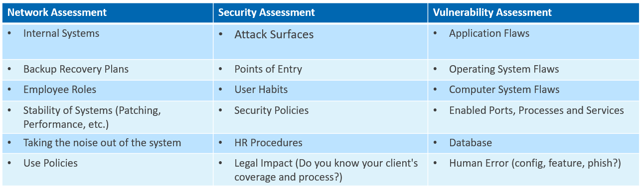 Cybersecurity risk assessments involve three essential elements: a network assessment, a security assessment, and a vulnerability assessment.