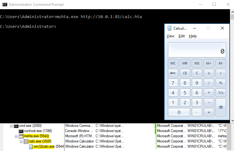 In the activity above, you can see that we are using Mshta to execute our crafted HTA file that contains a script that launches calc.