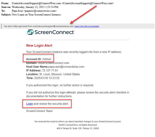 A key detail to remember: Legitimate ScreenConnect login alerts never include a "click here" link. If you receive an email with such a link, it is not from ConnectWise.
